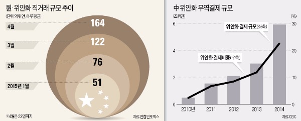 한국이 위안화 허브가 되려면 우선 위안화 수요와 공급기반을 확충해 나가야 한다. 지난해 12월 시작된 원·위안 직거래가 비교적 활발한 편이다. 하루평균 위안화 거래량이 개설 직후인 지난해 12월 54억위안에서 올 4월에는 164억위안으로 급증했다. 원·달러 거래량의 30%에 이른다.