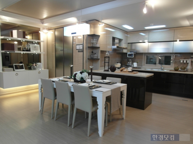 모델하우스에는 74㎡, 84㎡A, 84㎡C, 99㎡ 등 4개의 유닛이 전시되어 있다. 공통적으로 일반적인 아파트 보다 천장고가 10cm 높은 2.4m다, 거실과 일부 주방의 우물천장을 합하면 층고가 2.5m에 이른다. 그만큼 공간감이 더 넓게 느껴지는 효과가 있고 수납장을 높이 쌓을 수 있다.