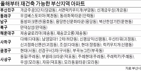 하지만 재건축 기한 단축에 의문을 제기하는 목소리도 나온다. 부동산업계 관계자는 “최근 들어 부산의 재건축사업이 줄줄이 해제절차를 밟고 있는데 재건축 연한을 단축한다고 해서 얼어붙은 재건축시장이 활기를 띨지 의문”이라고 설명했다.