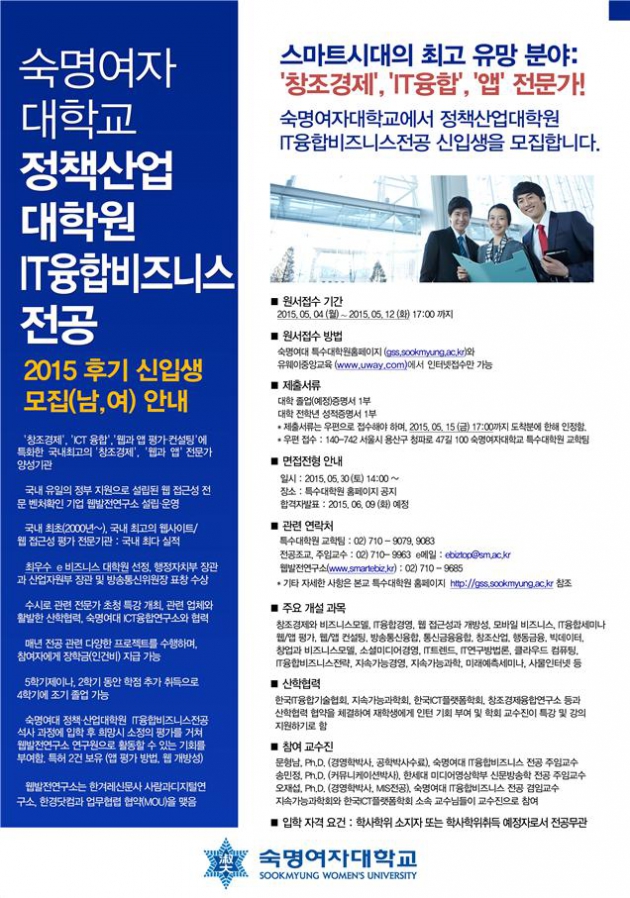 숙명여대 정책·산업대학원 IT융합비즈니스전공 2015 후기 신입생 모집(남·여)