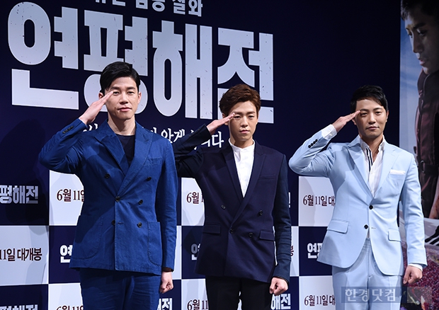 [ 변성현 기자 ] 배우 김무열(왼쪽부터), 이현우, 진구가 6일 오전 서울 신사동 CGV압구정에서 열린 영화 '연평해전'(감독 김학순, 제작 ㈜로제타 시네마) 제작보고회에 참석해 포토타임을 갖고 있다.