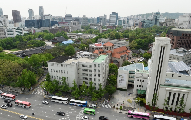 서울시는 6일 광복 70주년 기념 사업의 일환으로 일제가 지은 국세청 별관(사진 가운데 도로쪽 흰건물)을 8월 철거하기로 했다. 서울시의회(오른쪽)와 덕수궁 사이에 있는 국세청 남대문별관은 1937년 일제가 덕수궁 내부를 볼 수 없게 하려고 지은 것으로 알려져 있다.