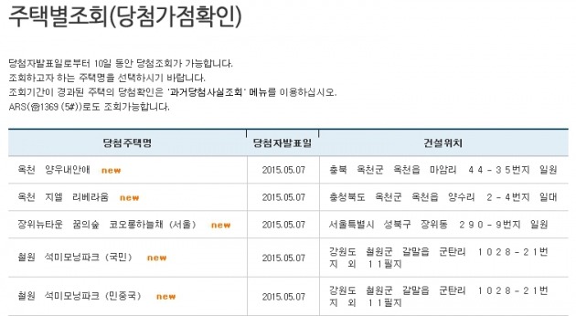 분양당첨자를 발표한 아파트 4곳과 주소는 장위뉴타운 꿈의숲 코오롱하늘채(서울특별시 성북구 장위동), 옥천 양우내안애(충북 옥천군 옥천읍 마암리), 옥천 지엘 리베라움(충청북도 옥천군 옥천읍 양수리), 철원 석미모닝파크(강원도 철원군 갈말읍 군탄리)이다.