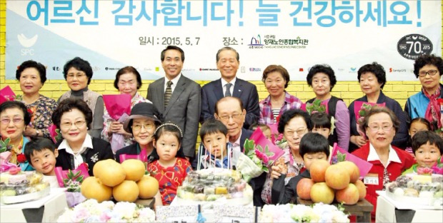 7일 오전 서울 서초구에 있는 양재노인종합복지관. 올해로 창립 70주년을 맞은 SPC그룹이 어버이날을 하루 앞두고 이곳에서 연 칠순잔치 ‘해피버스데이 파티 70’에 참석한 이복려 씨(70)는 감격스러운 표정을 지었다. 조상호 SPC그룹 총괄사장이 “70세 어르신들과 함께 1945년에 태어난 SPC그룹은 여러분의 성원으로 한국뿐 아니라 미국과 중국 프랑스에까지 진출한 글로벌 기업이 됐다”며 감사의 인사를 전하자 이씨는 “이런 자리를 마련해줘 고맙다”며 조 사장의 손을 한동안 놓지 않았다.