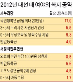 야당의 무상복지 전략에 뒤통수를 맞은 새누리당도 2012년 총선부터 국공립 보육시설 확대, 0~5세 교육비 지원 등 무상복지 공약 경쟁에 뛰어들었다. 같은 해 치러진 대통령 선거 과정에서는 여야를 막론하고 막대한 재정이 필요한 무상복지 공약을 백화점식으로 제시했다. 박근혜 당시 새누리당 후보는 누리과정(3~5세 무상보육), 4대 중증질환 100% 국가 부담, 기초노령연금 등을 앞세웠다. 문재인 민주통합당 후보도 무상급식과 무상보육을 핵심 복지 공약으로 제시했다.