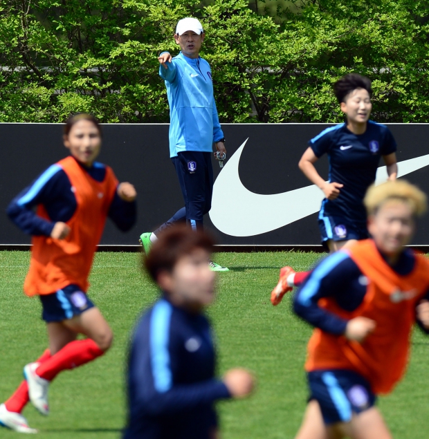 `2015 캐나다여자월드컵`을 앞두고 한국여자축구대표팀이 13일 경기도 파주 국가대표팀트레이닝센터(NFC)에서 훈련을 가졌다. 여자축구대표팀 윤덕여 감독이 선수들의 훈련을 바라보고 있다.