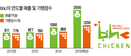 요즘 치킨 프랜차이즈 업계에서 가장 주목받고 있는 브랜드는 bhc다. 200여개의 업체가 난립해 포화 양상을 보이는 치킨시장에서 bhc는 올 들어 월평균 40개씩 점포가 늘며 ‘나홀로’ 성장하고 있다.회사 측은 현 추세대로라면 4월 말 기준 980개인 점포 嗤?연말까지 1200개로 늘릴 수 있을 것으로 기대하고 있다. 가맹점이 급증한 덕에 올 1~4월 매출은 631억원으로, 지난해 같은 기간의 292억원에 비해 116.5% 증가했다.