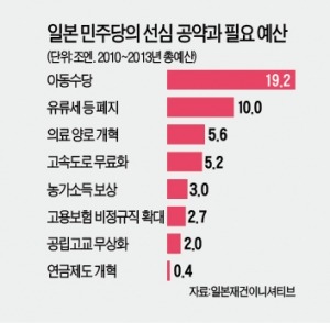 일본 민주당의 몰락은 예고된 것이었다는 지적이 많다. 공약으로 내세운 선심 복지정책들이 대부분 실현 불가능했기 때문이다. 2009년 총선을 앞둔 민주당은 월 2만6000엔의 아동수당 지급, 공립고등학교 무상교육, 고속도로 통행료 무료화 등 복지 공약을 쏟아냈다. 월 7만엔의 최저연금 보장, 75세 이상 고령자 무상의료, 농가 생산-판매비 차액 보상, 고용보험 비정규직 확대 등도 포함 틈?문제는 재원이었다. 연간 16조8000억엔의 추가 예산이 필요한 공약이었지만 세금은 한 푼도 더 걷지 않겠다고 공언했다. 예산 효율화와 세제 개혁 등을 방법으로 제시했다. 하지만 실제 재원 확보 금액은 2010년 9조8000억엔, 2012년엔 4조4000억엔에 머물렀다. 글로벌 금융위기 여파로 세수가 덜 걷힌 탓도 있지만 민주당 내부에서조차 현실성이 떨어진다는 지적이 많았다.