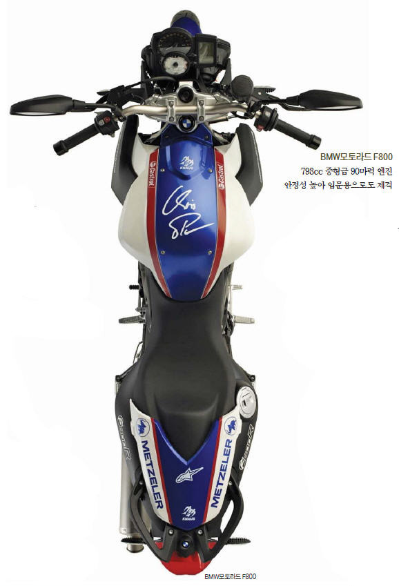 국산 브랜드 KR모터스는 라오스의 한상기업인 코라오그룹이 옛 S&T모터스를 인수해 사명을 변경한 회사다. KR모터스는 소형 스쿠터인 비버부터 비즈니스용 에스코트, 대형 모터사이클인 미라주까지 다양한 차종을 갖추고 있다. 가장 많은 판매량을 차지하는 모델 중 하나인 엑시브는 20~30대 젊은이들 중 역동적인 주행을 선호하는 이들의 입문용 스포츠 모터사이클이다. 1995년 처음 출시됐으며 올해로 20주년을 맞았다. 신형 엑시브는 최고출력 28마력의 힘을 내는 배기량 249㏄짜리 엔진을 차체 중앙 하부에 장착해 무게중심을 낮춘 것이 장점이다. 엑시브는 250N과 250R 두 가지로 구성됐다. 250N이 250R보다 상대적으로 얌전한 성격을 갖고 있어 입문용으로 적합하다. 시트높이가 790㎜로 250R(810㎜)보다 낮아 승하차도 편리하다. 250R은 핸들 위치가 낮고 차체 앞부분에 공기저항을 줄여주는 덮개(카울)가 있어 공격적인 주행이 가능하다. 250N은 460만원, 250R은 499만원이다.BMW모토라드, 중형급의 존재감 ‘F800’