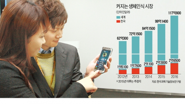 국내에서도 IT 서비스 회사인 삼성SDS 등이 생체인증사업에 뛰어들었다. 삼성SDS는 지난달 생체인증 국제표준단체인 FIDO협회로부터 세계 두 번째로 생체인식 기술을 인증받았다. 이 협회에는 삼성전자 구글 MS 비자카드 페이팔 등 190여개 글로벌 회사가 참여하고 있다. 전동수 삼성SDS 사장은 “생체인증 솔루션을 활용한 기업형 모바일 보안제품이 회사 성장의 한 축으로 자리 잡을 것”이라고 말 杉?