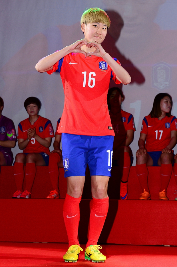 12년 만에 월드컵에 나서는 윤덕여 감독이 이끄는 여자축구대표팀의 강유미가 18일 서울 광화문 KT올레스퀘어에서 열린 `2015 FIFA 캐나다 여자월드컵 출정식`에서 매력을 발산하고 있다.
