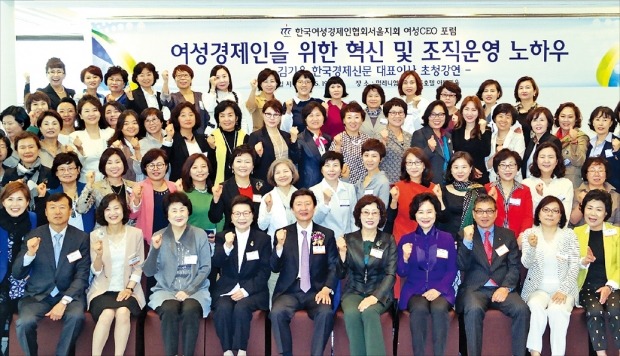 한국여성경제인협회 서울지회는 19일 서울 중구 밀레니엄힐튼호텔에서 여성 최고경영자(CEO) 조찬포럼을 열었다. 김기웅 한국경제신문 사장(앞줄 왼쪽 여섯 번째)이 ‘여성 CEO를 위한 혁신 및 조직운영 노하우’를 주제로 강연했다. 여봉례 여성경제인협회 서울지회장(일곱 번째), 신수연 여성경제인협회 고문(다섯 번째), 정구학 한경 독자서비스국장(두 번째) 등 150여명이 참석했다.