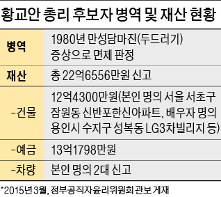황 후보자는 2011년 8월 부산고검장을 끝으로 공직에서 물러난 뒤 1년5개월간 법무법인 태평양에서 근무하며 15억9000여만원을 받았다. 한 달 평균 9355만원을 받은 것이다. 당시 인사청문회에서 황 후보자는 “로펌에서 받은 급여 일부를 기부할 용의가 있다”고 말했다. 2013년 국정감사에서는 “기부를 했느냐”는 야당 의원의 질문에 “기부는 했지만 언제 어디에 얼마를 기부했는지는 밝히지 않겠다”고 답했다. 두드러기성 피부 질환인 만성담마 坪막?병역을 면제받은 사실을 놓고도 공방이 오갈 것으로 예상된다. 황 후보자의 부인과 처가가 1999년 용인 수지 아파트 분양권을 전매해 아파트 두 채를 매입했다는 부동산 투기 의혹도 받고 있다.
