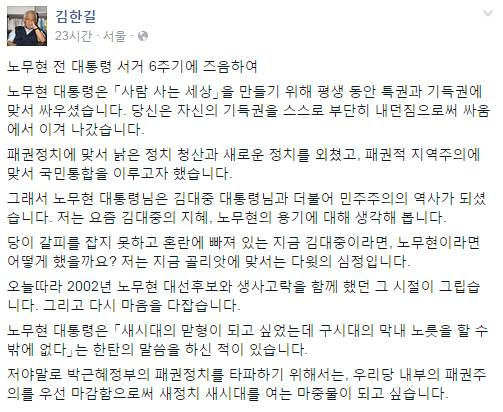 노무현 서거 6주기를 하루 앞둔 22일, 김한길 전 대표는 자신의 페이스북을 통해 "노무현 전 대통령 서거 6주기에 즈음하여"란 제목의 글을 게시했다.