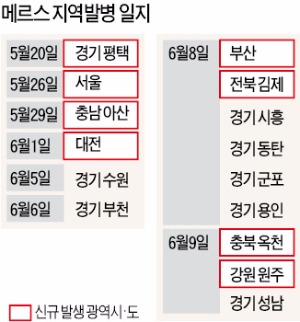 중동호흡기증후군(MERS·메르스) 환자가 전국 각지에서 발생하고 있다. 메르스 감염 지역은 지난주까지만 해도 평택성모병원과 100㎞ 이내인 서울 경기 충남 일대에 국한됐지만 이번주 들어선 부산 강원 전북 등으로 확산 중이다. 삼성서울병원 등 메르스 확진환자가 거쳐간 병원을 방문한 사람들이 정보 비공개로 감염 사실을 인지하지 못한 채 거주지로 돌아갔기 때문이다. 전문가들은 병원 밖에서 메르스가 옮겨지는 ‘지역사회 감염’이 발생할 가능성도 있다고 분석했다.