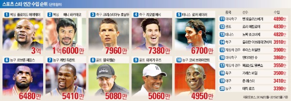 복싱 투톱이 1, 2위를 차지했고 축구 투톱이 그 뒤를 이었다. 레알 마드리드의 크리스티아누 호날두(포르투갈)가 7960만달러(약 882억원), FC바르셀로나의 리오넬 메시(아르헨티나)가 7380만달러(약 818억원)를 벌었다. 1992년 2월생인 네이마르 다실바(브라질)는 100명의 선수 중 최연소였다. 네이마르는 3100만달러(약 343억원)의 수입으로 23위에 올랐다.