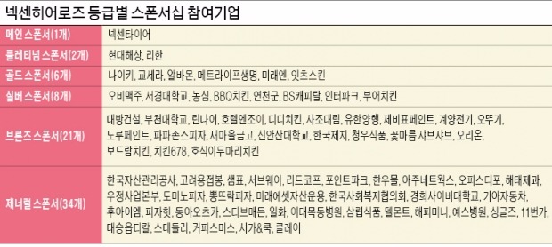 넥센히어로즈의 팀 스폰서 방식은 등급제로 운용된다. 후원 금액에 따라 플래티넘, 골드, 실버, 브론즈, 제너럴 등급으로 나뉜다. 경기장 내 광고판, 유니폼, 헬멧 등에 인쇄되는 광고 위치와 크기가 이 등급 기준에 따라 달라진다. 메인 스폰서 넥센타이어의 경우 비밀유지 조항에 따라 정확한 금액이 공개되지는 않았다. 하지만 연간 60억원 수준이라는 게 업계의 대체적인 추산이다. 아래 단계인 플래티넘은 30억원, 골드는 10억원대 수준이다.