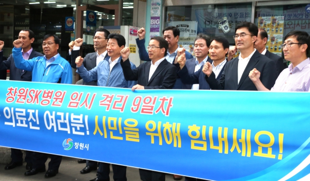 경남 창원시가 메르스 확산 방지를 위해 행정력을 집중하고 있는 가운데 안상수 시장이 19일 간부공무원들과 함께 임시 폐쇄된 창원SK병원을 찾아 격리된 입원환자와 의료진을 격려했다.