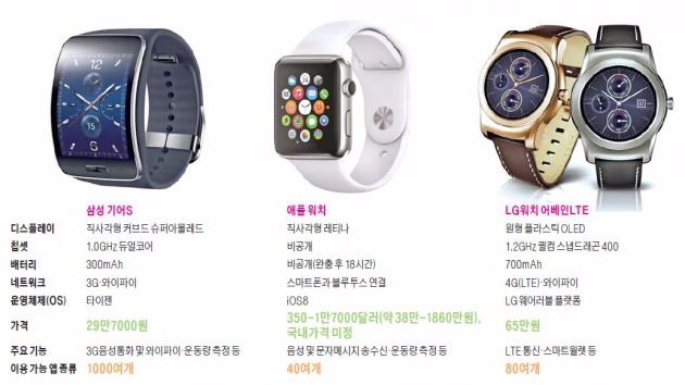 애플워치와 국내에서 판매 중인 주요 스마트워치 제품인 삼성 기어S, LG워치 어베인LTE의 가장 큰 차이점은 통신 기능이다. 애플워치는 스마트폰과 블루투스로 연결해 이용한다. 스마트폰과 가까이 있어야 대부분 기능이 제대로 작동한다. 반면 삼성 기어S, LG워치 어베인LTE는 스마트폰이 없어도 이용 가능하다. 각각 3G LTE 등 자체 이동통신 기능을 갖추고 있어서다. 기어S나 어베인LTE만 차고 나가도 스마트폰으로 오는 전화와 문자메시지를 놓치지 않고 받을 수 있다. 대신 제품 구매 비용 외에 월 1만원 안팎의 통신 요금을 내야 한다.어베인LTE는 근거리무선통신(NFC) 기반 결제 기능을 갖췄다. 대중교통을 비롯해 편의점 영화관 등 전국 5만여개 가맹점에서 이용할 수 있다. 애플워치는 애플페이란 결제 기능을 갖췄으나 국내에선 사용할 수 없다. 애플페이가 국내에서 상용화되지 않아서다. 기어S도 결제 기능이 없다.