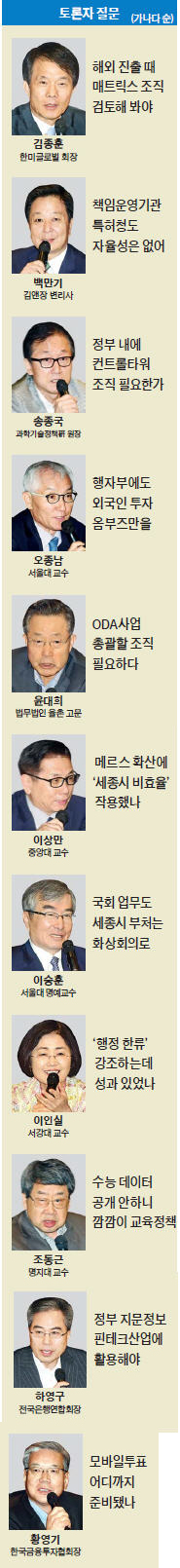▷정 장관=특허청은 혁신 개념으로 들여다보겠다. 책임운영기관에는 우수한 인재가 와야 한다. 예를 들어 경찰병원도 책임운영기관으로 지정돼 있는데, 장관급 월급을 준다고 해도 대한민국 최고의 의사가 이곳 원장으로 오지 않을 것이다. 우수한 인재를 오게 할 체계를 고민해야 한다.▷윤대희 법무법인 율촌 고문=우리나라는 2009년 경제협력개발기구(OECD) 산하 개발원조위원회에 가입해 원조하는 나라가 됐다. 기획재정부 농림축산식품부 국토교통부 외교부 등 다양한 부처와 기관에서 공적개발원조(ODA) 사업을 하고 있다. 장기적인 관점에서 ODA 사업을 체계적으로 관리하는 총괄 조직이나 기구가 필요한 시기가 됐다.