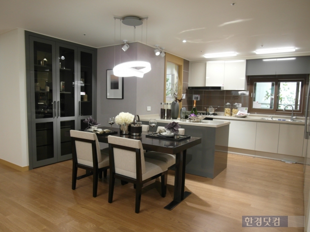 거실과 마주한 주방 또한 넓은 편이다. 아일랜드 식탁을 비롯해 붙박이로 유리장이 설치된다. 6인용 식탁을 넣어도 될 정도로 공간감이 넉넉하다. 가족간의 소통과 홈스쿨링이 가능하도록 주방에는 식사 테이블, 수납장 등을 연계 배치한 다이닝 북카페를 조성할 예정이다.