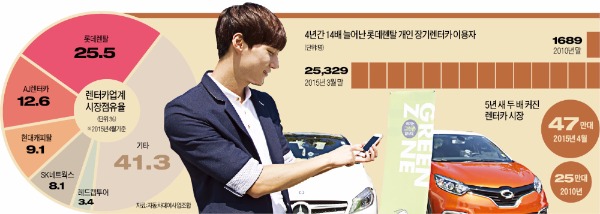 대기업 임원이나 정부 부처에서 주로 이용하던 장기렌터카가 최근 개인으로 빠르게 퍼지고 있다. 롯데렌탈의 개인 장기렌터카 이용자 수는 2010년 말 1689명에서 지난 3월 말 기준 2만5329명으로 4년3개월 만에 14배 늘었다. 매년 70~80%대 성장세를 이어가고 있다. 장기렌터카 시장에서 개인이 차지하는 비중도 2010년 4.7%에서 올 3월 말 26.9%로 높아졌다.
