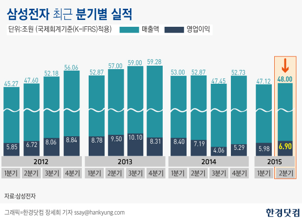 노 연구원은 "2분기 갤럭시S6와 갤럭시S6엣지 출시에도 불구하고 매출액이 전분기 대비 1조원 증가하는 데 그친 것은 우려할만한 부분"이라며 "앞으로 수요에 대한 문제가 제기될 수 있다"고 분석했다.