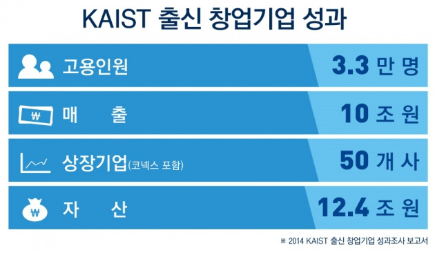 보고서에 따르면 KAIST 창업기업은 2013년 말 기준으로 1069곳 자산 합계액 12조4440억원, 매출액 합계 10조130억원, 연간 고용인원 3만3465명에 달했다. 또한 조사 대상 기업 중 유가증권 2개, 코스닥 43개, 코넥스 5개 등 50개 기업이 증권시장에 상장됐다.