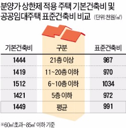 현재 공공임대주택 표준건축비는 전용면적 60㎡ 이상~85㎡ 미만 아파트 기준으로 ㎡당 평균 99만1000원이다. 택지지구 분양주택 기본건축비(144만9000원)의 68.4%에 불과하다.