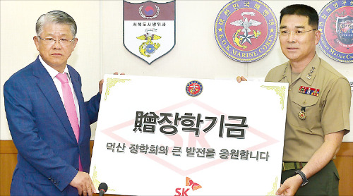 최신원 SKC 회장(63)은 10일 경기 화성 해병대 사령부 본청 2층 회의실에서 해병대 덕산장학회에 2억원을 기부한 뒤 이같이 말했다. 최 회장은 1973년 해병 258기로 입대해 경기 김포 2여단(현재 2사단)에서 복무했다.