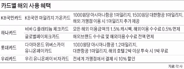 여름 휴가철이 시작되면서 해외 사용 시 혜택을 받을 수 있는 카드에 대한 관심이 커지고 있다. 지난 1분기 한국 국민이 해외에서 결제한 카드 사용액이 역대 최고치를 기록하는 등 해외여행을 떠나는 카드 소비자가 날로 늘어나고 있다.여신금융협회에 따르면 지난 1분기 국내 거주자가 해외에서 쓴 카드사용액은 지난해 같은 기간(28억2000만달러)보다 13.8% 증가한 32억1000만달러를 기록했다. 해외 출국자 수 또한 같은 기간 19.4% 증가한 약 470만명에 달했다.