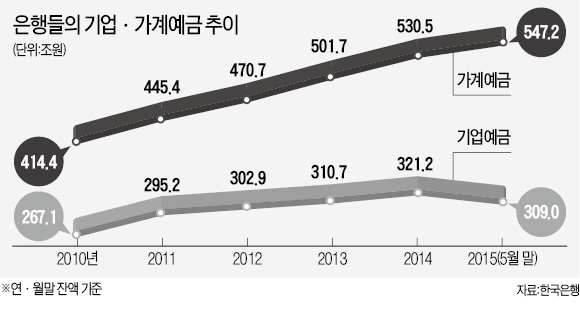 이런 흐름은 한국은행 통계에서도 확인된다. 2010년 말 약 267조원이던 국내 기업예금 잔액은 2014년 말 321조원까지 꾸준히 늘었다. 하지만 올해 들어 감소세로 돌아서 5월 말엔 약 309조원으로 떨어졌다.