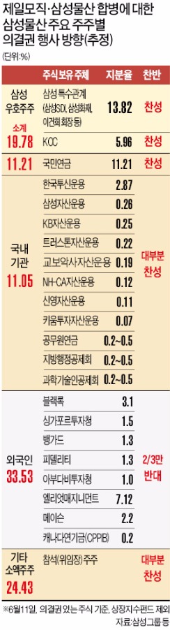 삼성물산의 승리를 이끈 주요인은 국내 기관투자가와 소액주주들의 ‘몰표’로 분석된다. 삼성물산 지분 22.26%를 보유한 국내 기관투자가들은 주총 직전까지 대부분 합병안에 찬성할 것으로 전망됐다. 지분 11.21%를 보유해 개별 주주로는 지분율이 가장 높은 국민연금이 지난 10일 합병에 찬성키로 결정하면서 다른 기관투자가도 대부분 뒤를 따랐다. 이번 합병안에 찬성한 한국투자신탁운용(지분율 2.87%) 관계자는 “최근 통합 삼성물산의 주주가치 제고 방안이 나온 데다 이번 사태를 계기로 주주들을 더욱 신경쓸 것이라는 점을 고려해 합병에 찬성했다”고 말했다.