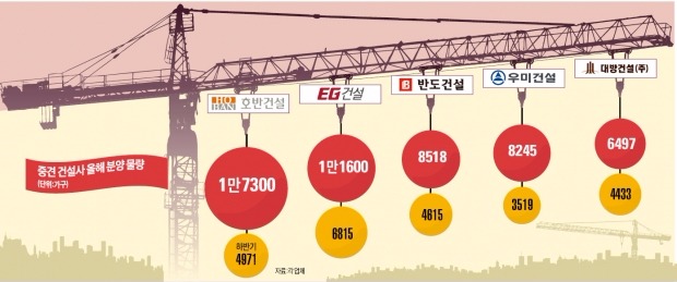 올해 1만가구 안팎을 공급하는 호반·우미·EG·반도·대방건설 등 ‘중견 건설사 빅5’가 상반기에만 많게는 1만가구에 달하는 아파트 용지를 추가로 사들였다. 내년 이후 아파트를 분양할 수 있는 용지다. 내년에도 분양시장이 호황세를 이어갈 가능성이 높다고 보고 공격적으로 아파트 용지를 매입했다는 분석이다.
