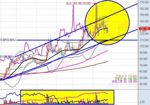 기관의 매수세가 꾸준히 이어지면서 11만원대의 고점대를 돌파하는 모습을 연출