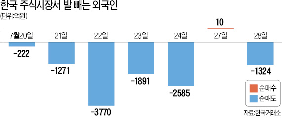 한국 시장에 큰 영향력을 발휘하는 외국인도 발을 빼는 모습이 뚜렷하다. 올 상반기 유가증권시장에서 8조6845억원어치를 순매수한 외국인은 7월 들어 1조8891억원 순매도로 돌아섰다. 20일 이후로만 순매도액이 1조1057억원에 달하는 등 유출세가 가팔라지고 있다.