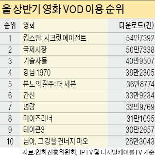 대중성은 낮지만 작품성이 있는 영화 VOD의 인기도 눈에 띈다. 한 노부부의 삶을 다룬 잔잔한 다큐멘터리 영화인 ‘님아, 그 강을 건너지 마오’는 극장 206개 스크린에서 개봉한 작품이다. 대형 블록버스터의 20~25%에 그치는 스크린 규모로 많은 상영관을 확보하지는 못했지만 VOD시장에서는 28만건이 넘는 이용횟수로 10위권에 이름을 올렸다. 춤을 출 자유를 찾아 유럽으로 떠난 이란 무용수의 실화를 다룬 ‘데저트 댄서’ 등 진지한 주제를 다룬 영화도 극장을 거치지 않고 IPTV에서 개봉해 인기를 끌고 있다.