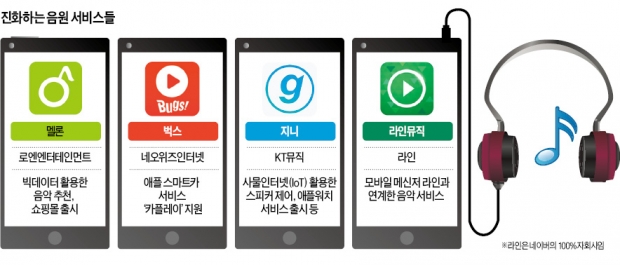 멜론 벅스 지니 등 국내 음원 사이트들이 빅데이터, 사물인터넷(IoT) 등을 활용한 신개념 음악 서비스를 속속 선보이고 있다. 기존의 단순한 음악 스트리밍(온라인 실시간 전송) 서비스를 넘어 종합 음악 플랫폼으로 진화하려는 시도가 잇따르고 있다. 애플 구글 등 내로라하는 글로벌 정보기술(IT) 강자들이 음악 스트리밍시장에서 영향력을 확대하고 있는 가운데 국내 업체들이 차별화한 서비스로 가입자 확대에 나서고 있는 것이다.