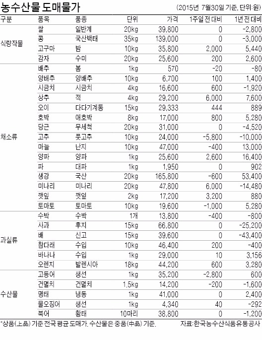 닭고기 소비자 가격은 이달 들어 초복(7월13일) 특수에 대한 기대심리로 올랐다가 실제 소비는 부진했던 탓에 초복 이후 급락했다. 한국농수산식품유통공사에 따르면 닭고기 도계 1㎏의 평균 소매가격은 지난 13일 5818원에서 지난 29일 4973원으로 하락해 평년(5769원) 대비 13.8% 낮았다. 초복과 중복 때 날씨가 궂었던 데다 중동호흡기증후군(MERS·메르스) 여파로 삼계탕을 많이 사 먹는 외국인 관광객의 한국 방문도 줄어 닭고기 소비가 기대만큼 많지 않았다는 설명이다.