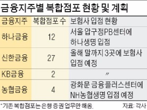하나금융이 국내 금융회사 최초로 은행과 증권, 보험점포를 한곳에 모은 복합점포를 개설하면서 복합점포 경쟁이 가속화하고 있다. 농협금융도 3일 은행·증권·보험 복합점포를 연다.하나금융과 농협금융의 은행·증권·보험 복합점포 개설은 금융위원회가 소비자 편의를 위해 금융지주사별로 3개 이내의 복합점포를 2년간 시범운영할 수 있도록 허용한 지 한 달 만이다. KB금융과 신한금융도 기존 은행·증권 복합점포 중 소비자 수요가 많은 곳에 계열 보험사를 입점시킬 방침이다. 반면 비(非)금융지주계열 보험사들은 은행계 보험사에 특혜를 주는 것이라며 반발하고 있다.