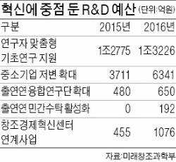창업 지원 예산도 확대한다. 전국 17곳에 설치한 창조경제혁신센터 관련 예산을 올해 455억원에서 내년 1076억원으로 136% 늘린다. 미국 과학재단(NSF)의 연구자 창업 지원 프로그램인 ‘I-Corps’를 벤치마킹한 사업도 신설하고 내년 40억원을 지원한다.