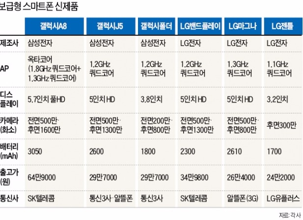 삼성전자는 지난달 22일 ‘갤럭시J5’에 이어 24일 ‘갤럭시A8’ 판매를 시작했다. 갤럭시J5는 셀피 기능이 강한 것이 특징이다. 보급형임에도 전면에 500만화소 카메라를 달았다. 통신 3사와 알뜰폰, 자급제폰으로 출시한다. KT는 갤럭시J5 이름을 ‘갤럭시센스’로 바꿔 판매한다.갤럭시A8은 디자인에 초점을 맞춘 것이 특징이다. 두께가 5.9㎜로 갤럭시 스마트폰 시리즈 가운데 가장 얇다. 테두리와 뒷면에 메탈(금속) 소재를 적용했다. SK텔레콤 전용으로만 출시되며 출고가는 64만9000원이다. 공시지원금과 추가지원금을 모두 받으면 20만원대에도 살 수 있다.