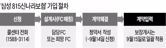 보험 가입은 신생아 부모가 삼성생명 콜센터(1588-3114)로 신청하면 된다. 이후 담당 설계사(FC)가 직접 찾아가 청약서와 함께 병원이 발행한 출생증명서를 받아 오게 된다. 희망하는 설계사를 지정할 수도 있다. 보험가입 신청과 청약서 작성은 9월14일까지 한 달간 이뤄진다. 보험 효력이 발생하는 보장 개시일은 9월15일로 일괄 적용하기로 했다.