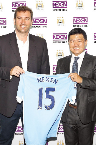 강호찬 넥센타이어 사장(오른쪽)과 영국 프로축구팀 맨체스터 시티의 페란 소리아노 최고경영자(CEO)는 6일(현지시간) 영국 맨체스터 풋볼아카데미에서 공식 파트너십 계약을 맺었다.
