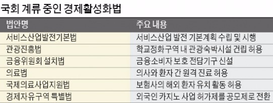 14일 국회에 따르면 정부가 처리를 요청한 경제활성화법안 중 6개가 아직 국회 상임위원회에 계류 중이다. 서비스산업발전법, 관광진흥법, 국제의료사업지원법, 금융위원회 설치법, 의료법, 경제자유구역 특별법 등이다. 서비스산업발전법은 2012년 7월 국회에 제출된 뒤 3년 넘게 상임위에 걸려 있다.
