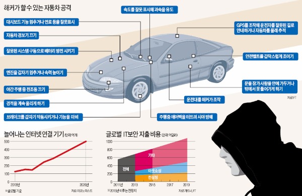 미국 GM은 지난달 30일 차량에 문제가 생겼을 때 구조요청을 보내는 통신 시스템이 해킹에 취약하다는 지적을 받고 부랴부랴 소프트웨어를 최신형으로 교체했다. 전기차인 테슬라 모델S도 이달 초 보안전문가의 해킹에 도로 위에서 갑자기 멈춰서는 아찔한 순간을 노출했다. 영국 파이낸셜타임스(FT)는 “해킹이 자동차산업 전체를 위협하고 있다”고 지적했다.