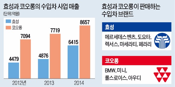 코오롱은 여러 수입차 브랜드를 취급하는 효성과 달리 BMW그룹 산하의 수입차만 판매해왔다. 효성이 독일차, 일본차, 이탈 ?팃糖?파는 다국적 전략을 취했다면 코오롱은 BMW 브랜드라는 한우물만 파온 셈이다.