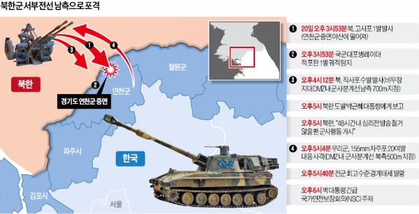 우리 군은 20일 오후 5시4분께 군사분계선 북측 500m 지점의 비무장지대에 155㎜ 자주포 20여발을 쏘았다. 북한군의 1차 도발이 이뤄진 뒤 71분 지난 시점이었다. 때문에 미온대응 논란이 일고 있다.