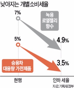 ‘소비절벽’ 우려를 해소하기 위한 조치도 마련됐다. 내년부터 개별소비세 대상 품목에서 제외되는 향수 녹용 로열젤리 개별소비세는 연말까지 7%에서 4.9%로 인하된다. 내년부터 개별소비세가 폐지되는 대용량 가전제품의 세율도 5%에서 3.5%로 낮아진다. 개별소비세가 없어질 때까지 구매를 미루는 소비자를 최대한 줄여보겠다는 취지다. 보석 귀금속 시계 가방 등에 붙는 개별소비세(20%)의 과세 기준가격도 27일부터 200만원에서 500만원으로 상향 조정된다.