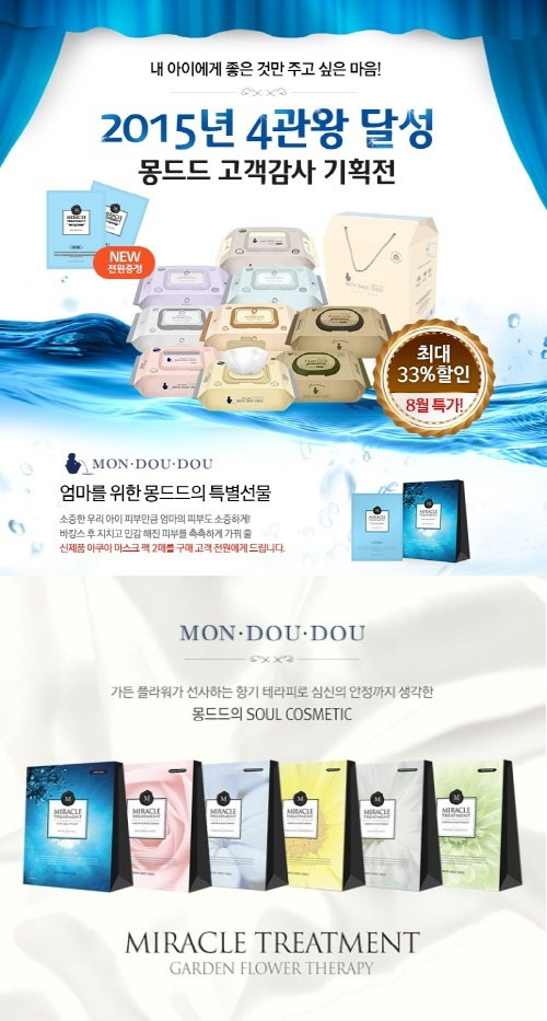 한편 몽드드는 소셜커머스 티몬에서 진행 중인 ‘몽드드 아기물티슈 4관왕 달성 기념 특별기획전’ 구매 고객 전원에게 마스크팩 신제품 6종 중 ‘수퍼아쿠아 테라피 블루워터’를 증정하는 이벤트를 진행 중이다.